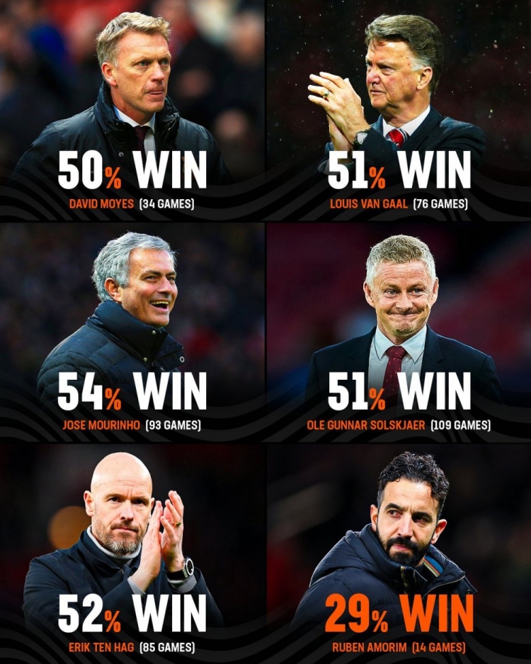 據(jù)統(tǒng)計(jì),自接手曼聯(lián)以來,阿莫林在英超中的勝率只有29%(14場(chǎng)4勝2平8負(fù)),是后弗格森時(shí)代曼聯(lián)所有正式教練中最低的。