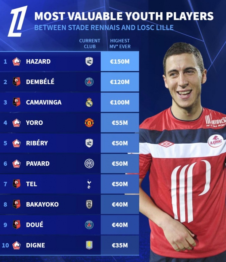 2月17日訊 《轉(zhuǎn)會市場》統(tǒng)計了里爾和雷恩兩家俱樂部培養(yǎng)的青訓(xùn)球員歷史身價最貴榜單,阿扎爾居首。