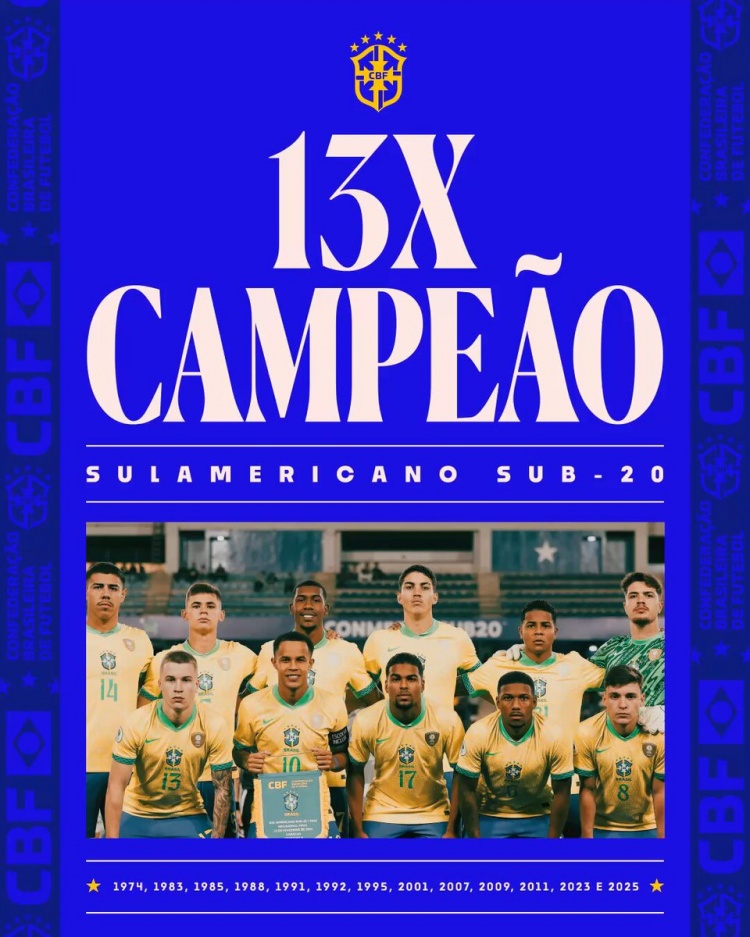 巴西隊(duì)官方社媒曬出奪冠海報(bào),慶祝球隊(duì)第13次獲得南青賽冠軍。