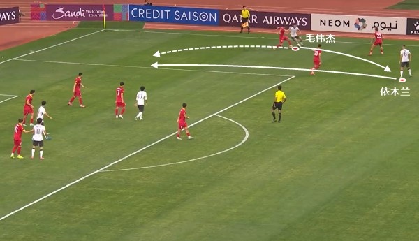 就像是這一次,隊友回傳后依木蘭面前是4名吉爾吉斯斯坦球員,通過快速的轉向,依木蘭總能調整出合適的出球角度。