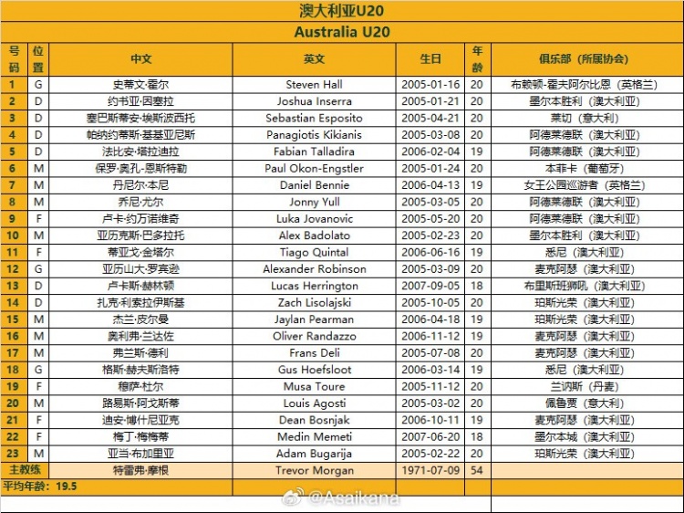 國(guó)青戰(zhàn)澳大利亞U20的23人名單如下: