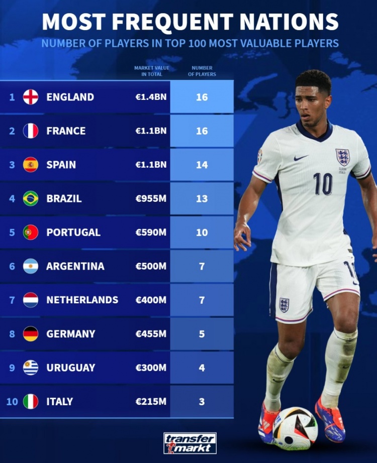 2月18日訊 《轉(zhuǎn)會(huì)市場(chǎng)》統(tǒng)計(jì)了當(dāng)前身價(jià)前100球員的國籍情況,英法并列居首。