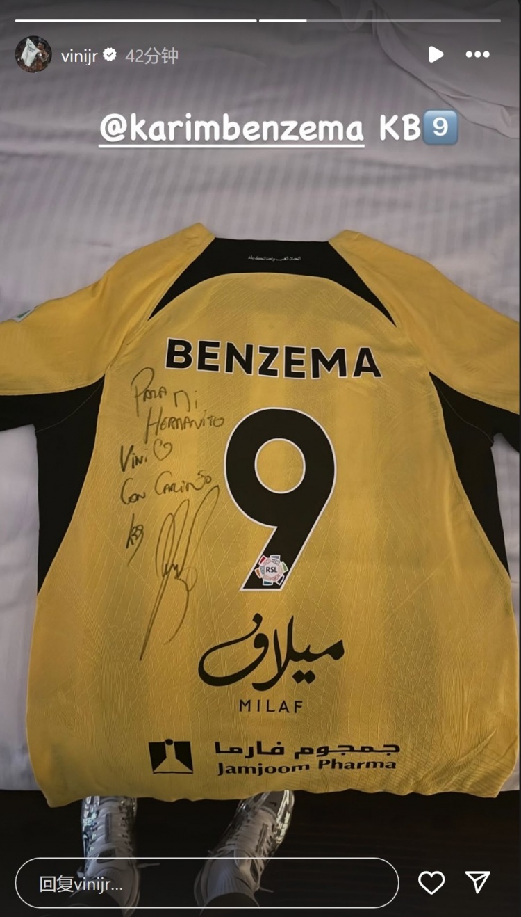 維尼修斯獲贈(zèng)本澤馬的簽名球衣,他在社交媒體上曬出球衣,配文:“本澤馬,KB9。”