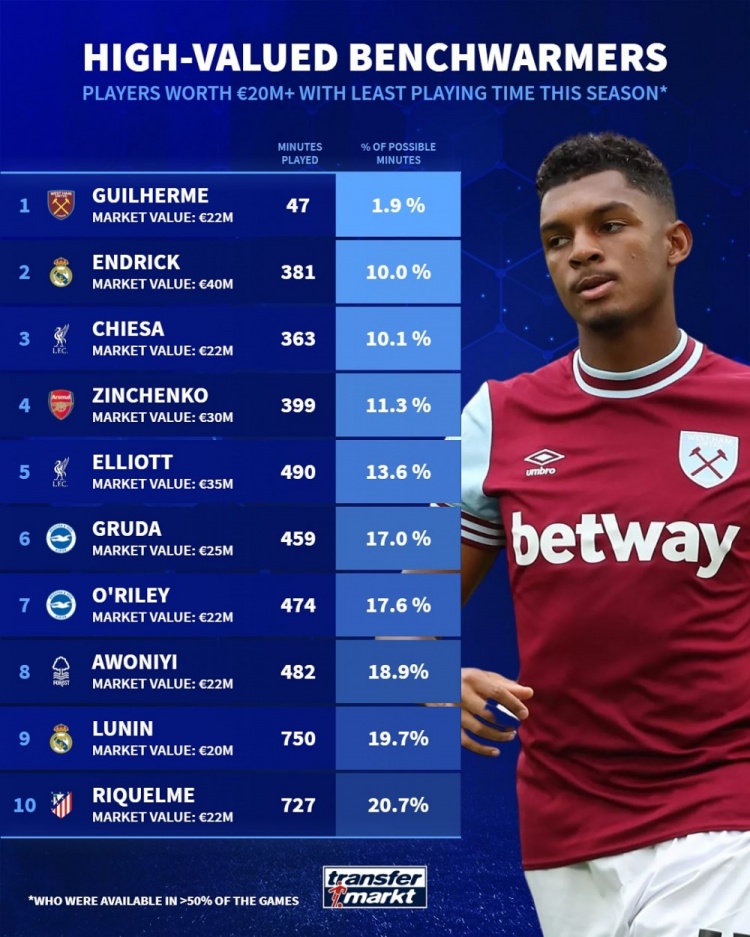 2月18日訊 德國轉(zhuǎn)會(huì)市場盤點(diǎn)了2000萬歐元以上身價(jià)球員的出場時(shí)間最少排行,西漢姆的吉列爾梅排名第一,僅出場47分鐘。