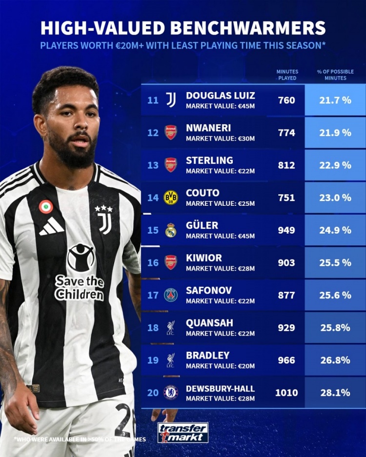 11、道格拉斯-路易斯,4500萬歐元,尤文,出場760分鐘,占總比賽時(shí)間21.7%