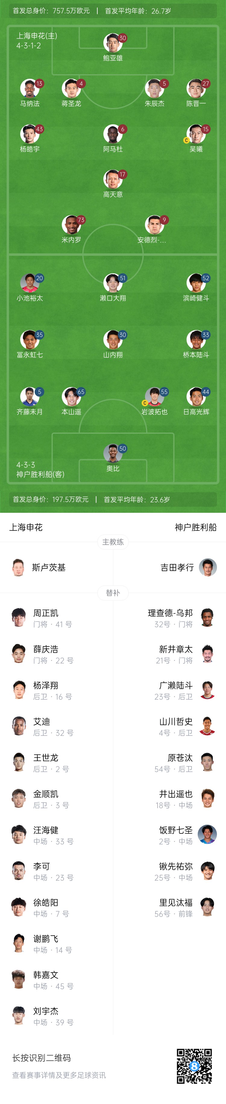 2月18日訊 北京時間今晚20點,亞冠精英聯(lián)賽東亞區(qū)第8輪,上海申花主場迎戰(zhàn)神戶勝利船,賽前兩隊公布首發(fā)陣容。