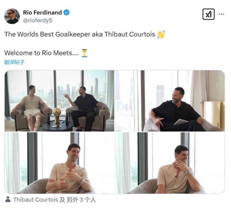 費(fèi)迪南德對(duì)庫(kù)爾圖瓦進(jìn)行了專訪,他在社交媒體上曬出照片,并配文:“世界最佳門將叫做庫(kù)爾圖瓦,歡迎來(lái)到Rio Meets節(jié)目?!?/p>