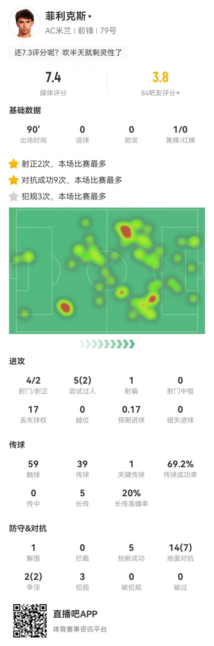 2月19日訊 米蘭在本輪歐冠1-1主場逼平費耶諾德,菲利克斯本場數(shù)據(jù)如下:
