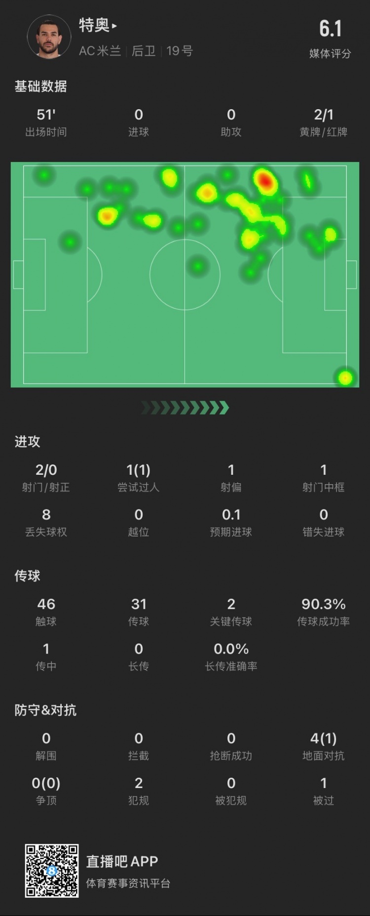2月19日訊 歐冠淘汰賽階段附加賽次回合,米蘭對(duì)陣費(fèi)耶諾德的比賽正在進(jìn)行。特奧染紅離場,出場51分鐘獲評(píng)6.1分。