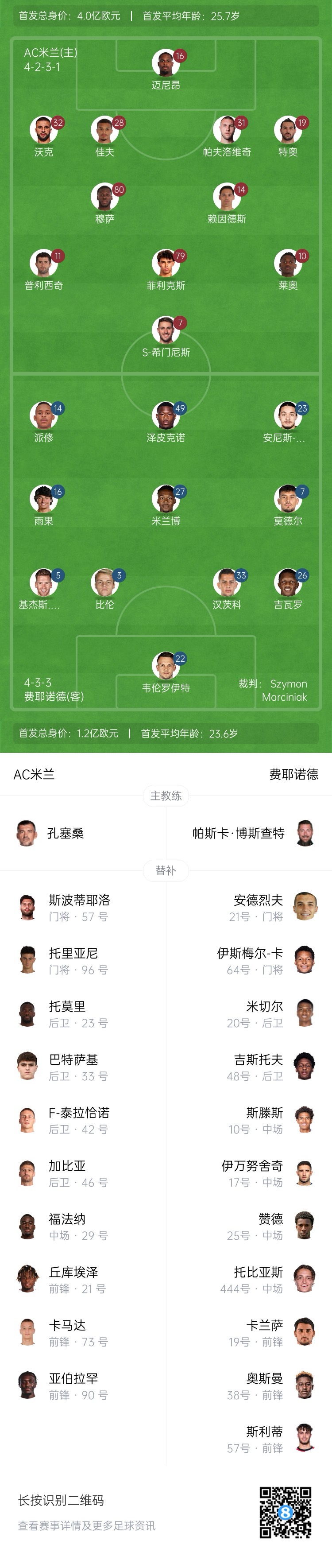 米蘭替補(bǔ):57-斯波蒂耶洛、96-托里亞尼、21-丘庫埃澤、23-托莫里、29-福法納、33-巴特薩基、42-泰拉恰諾、46-加比亞、73-卡馬達(dá)、90-亞伯拉罕