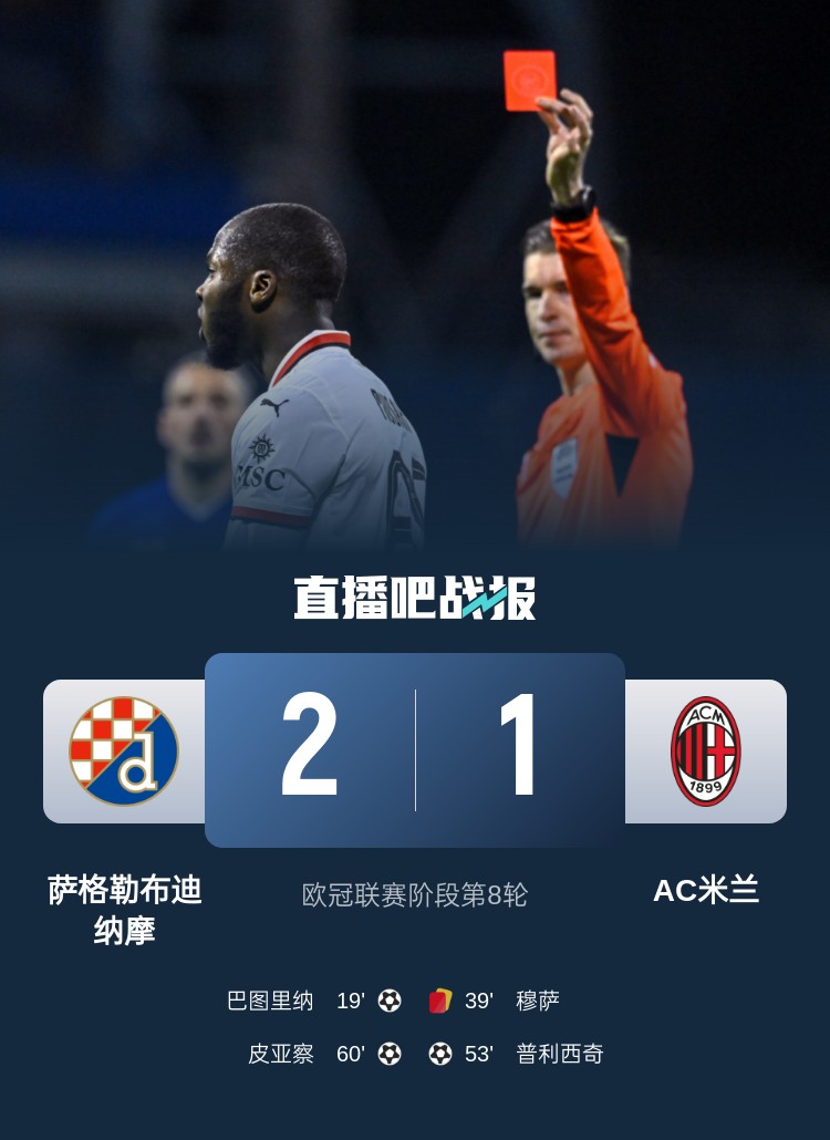歐冠聯(lián)賽階段最后一輪,米蘭也是因?yàn)榧t牌葬送好局勢(shì)。米蘭原本取勝可直接晉級(jí)16強(qiáng),但穆薩上半場(chǎng)就兩黃被罰下,米蘭最終1-2不敵薩格勒布迪納摩,無緣前八。
