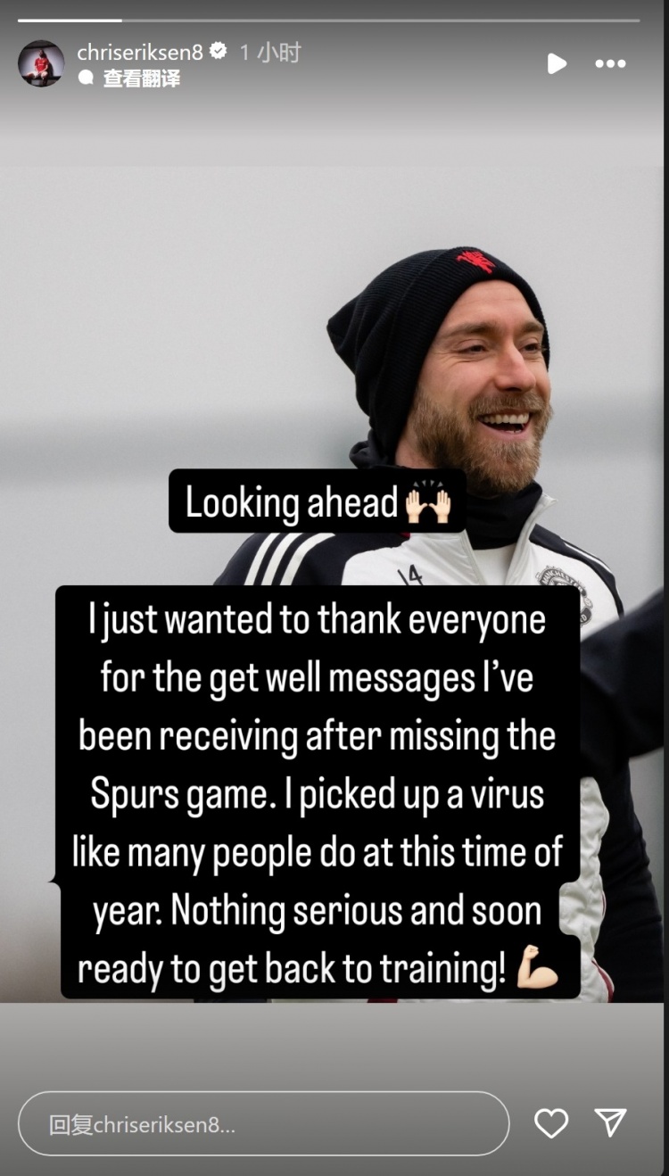 埃里克森寫道:“展望未來。我只是想感謝大家在我缺席對陣熱刺比賽后發(fā)來的祝福信息,我就像每年這個時候的很多人一樣感染了(流感)病毒,沒什么大礙,很快就可以恢復(fù)訓(xùn)練了!”