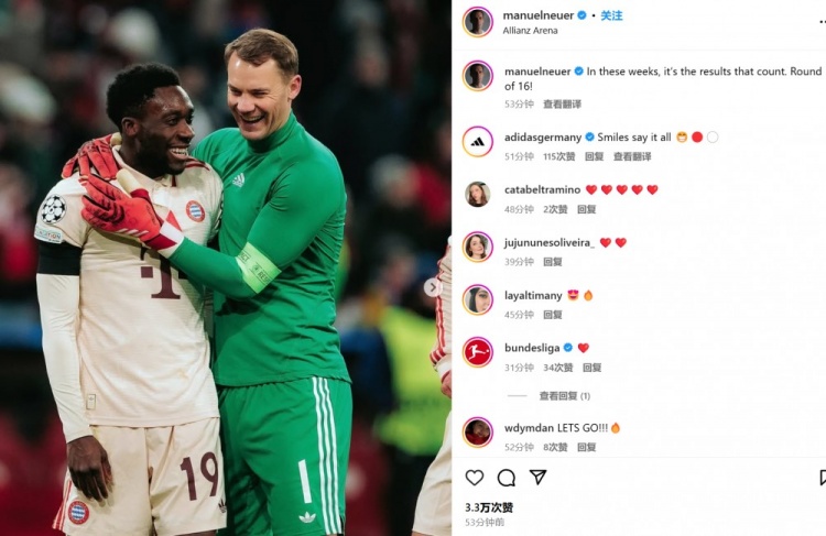 諾伊爾曬出自己和進(jìn)球功臣戴維斯的合照,并配文:“在最近幾周,結(jié)果才是最重要的。晉級(jí)16強(qiáng)!”