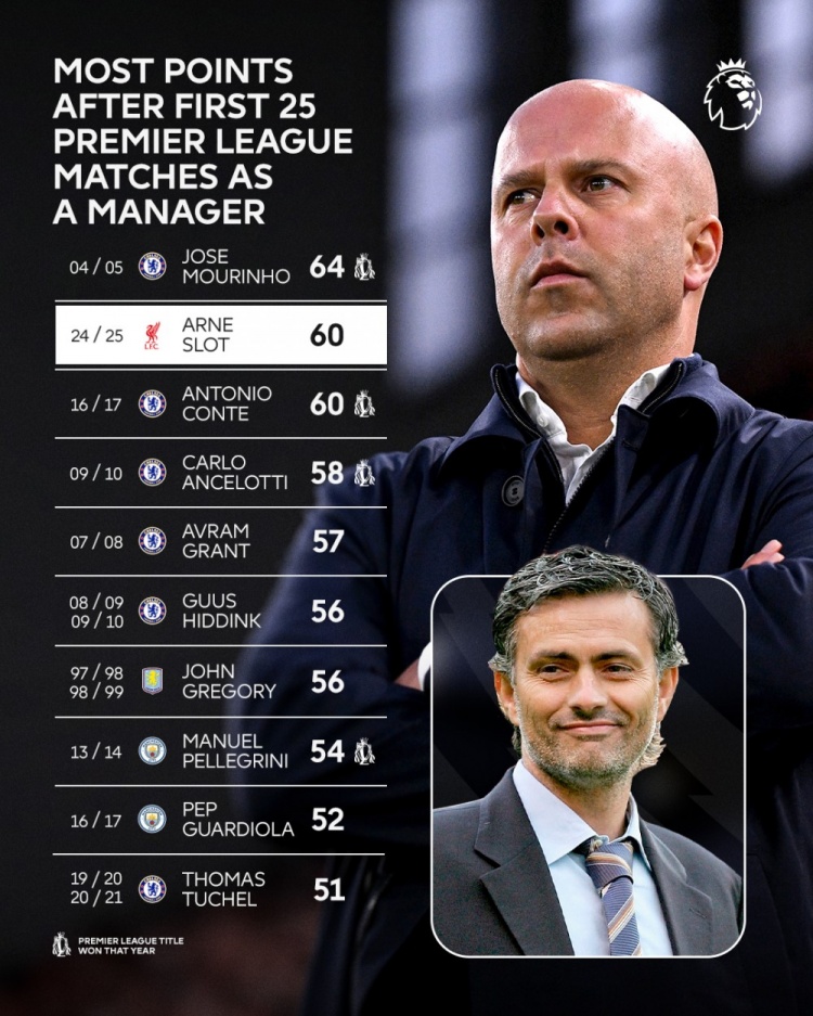 教練英超生涯前25場比賽積分排名:
