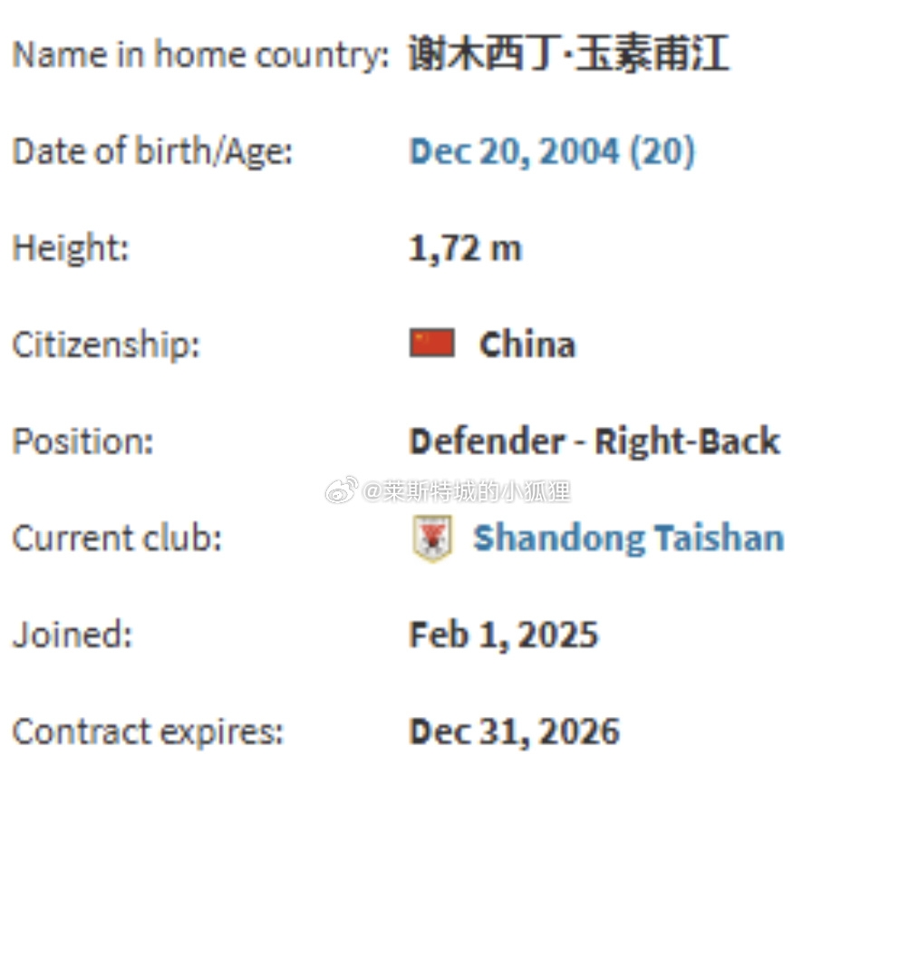 德轉(zhuǎn)頁面顯示,此前因年齡造假被禁賽三個月的球員謝木西丁·玉素甫江就是原中國U20國青隊員,山東泰山的玉蘇甫????