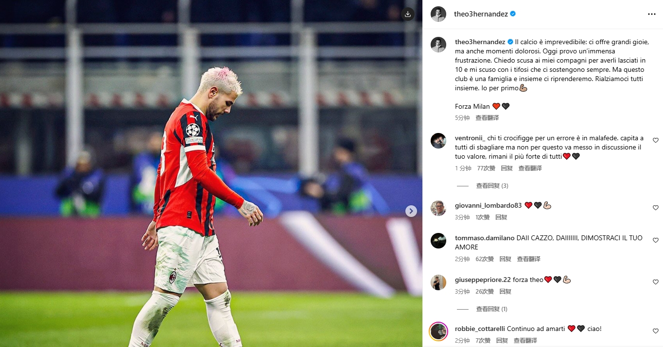 特奧:“足球是不可預(yù)測(cè)的,它帶給我們巨大的快樂,也有痛苦時(shí)刻。今天我感到無(wú)比的沮喪。我向我的隊(duì)友們道歉,因?yàn)槲易屗麄冎皇O?0個(gè)人作戰(zhàn)。我也向一直支持我們的球迷們道歉。但這個(gè)俱樂部就像是一個(gè)大家庭,團(tuán)結(jié)一致我們會(huì)恢復(fù)的。讓我們一起重新站起來(lái),從我開始。????????”