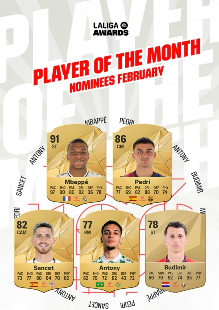 2月20日訊 西甲官方公布了2月份最佳球員的5人候選,姆巴佩、佩德里、安東尼入圍。在2月份,西甲還有第25輪比賽未進行。