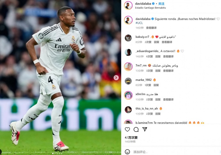 2月20日訊 皇馬在本輪歐冠3-1擊敗曼城,阿拉巴傷愈復(fù)出,在最后時刻替補(bǔ)登場。