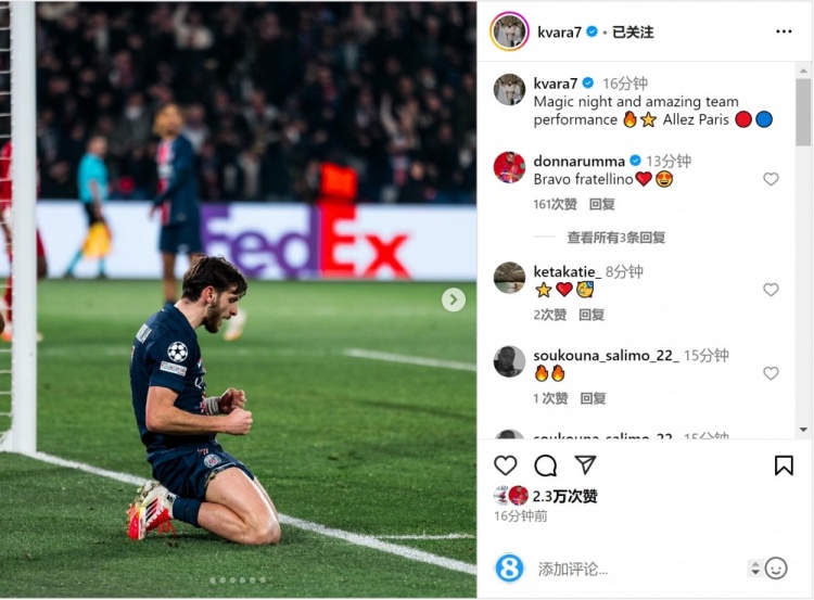 克瓦拉茨赫利亞在社交媒體上曬出慶祝的照片,配文:“神奇的夜晚,出色的團隊表現(xiàn)。加油巴黎!”