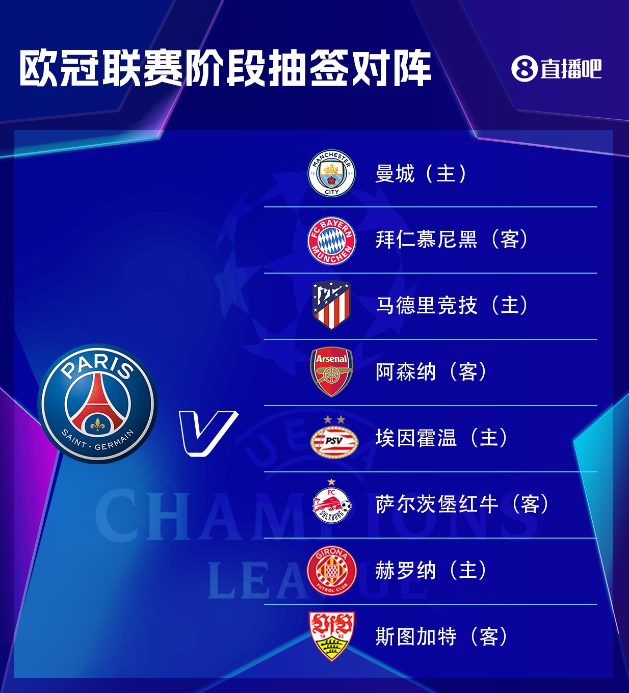 歐冠聯(lián)賽階段中,巴黎則是抽到了曼城、拜仁、馬競、阿森納、埃因霍溫、薩爾茨堡紅牛、赫羅納、斯圖加特。