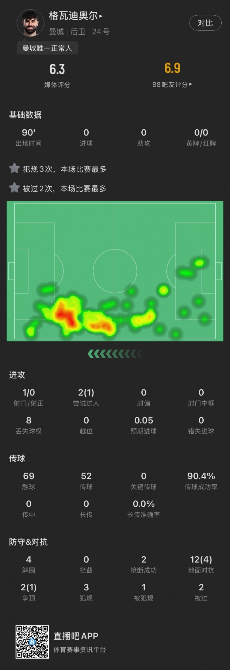 2月20日訊 在剛剛結(jié)束的歐冠淘汰賽階段附加賽次回合中,曼城1-3不敵皇馬,總比分3-6出局。本場(chǎng)比賽,格瓦迪奧爾成為姆巴佩進(jìn)球的背景板,僅獲評(píng)6.3分,和8分鐘傷退的斯通斯并列全場(chǎng)最低分。