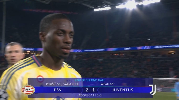 90分鐘比賽結(jié)束,尤文圖斯1-2埃因霍溫。