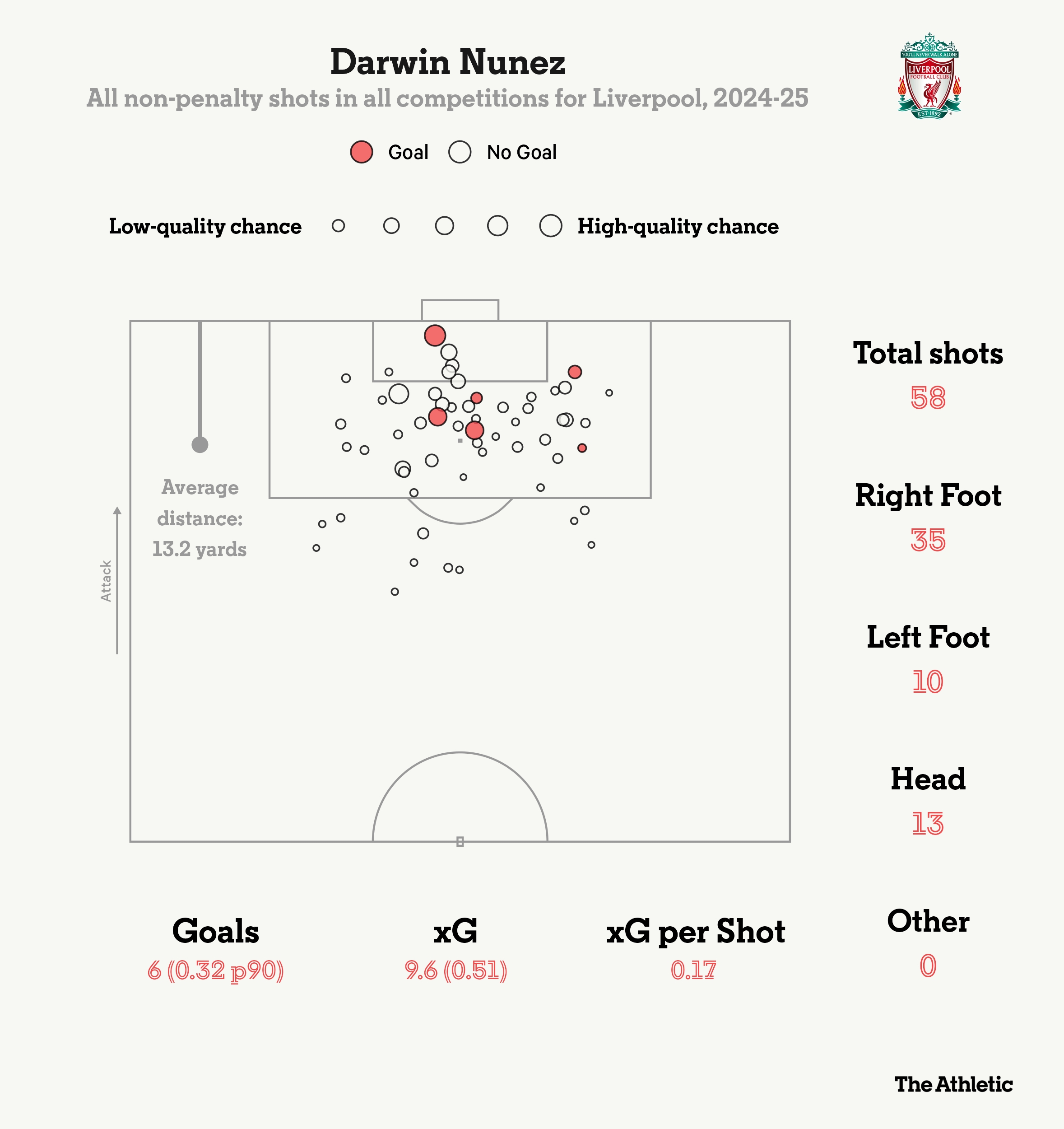 圓圈越大代表預(yù)期進(jìn)球越高努涅斯本賽季非點(diǎn)球射門射門數(shù)58次預(yù)期進(jìn)球9.6球實(shí)際進(jìn)球6球 標(biāo)簽: 足球 英超 利物浦
