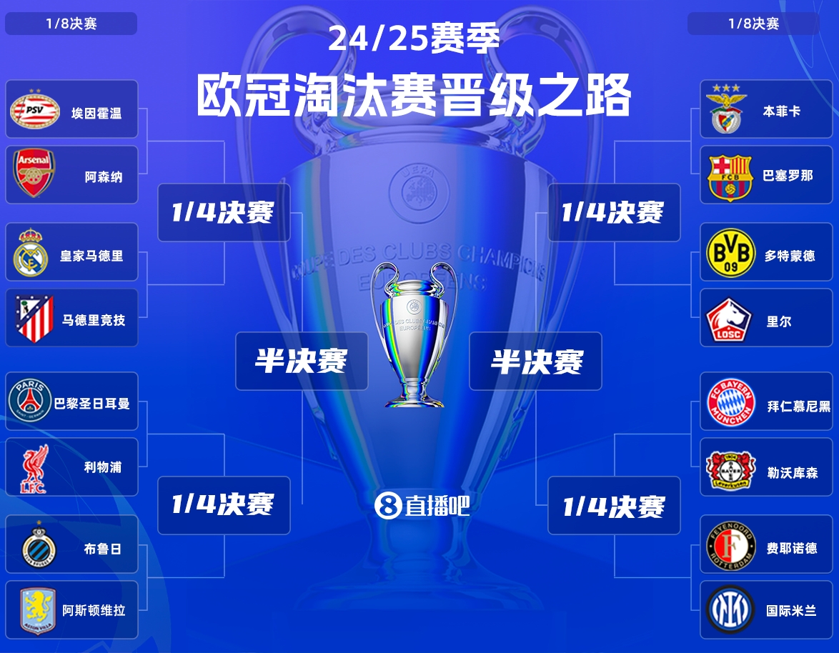02月21日訊 2024/25賽季歐冠淘汰賽抽簽結(jié)果已經(jīng)出爐,皇馬與馬競上演馬德里德比,拜仁與藥廠將本賽季第4次交手,巴黎抽到利物浦。1/8決賽捉對廝殺,爭奪8個晉級名額。