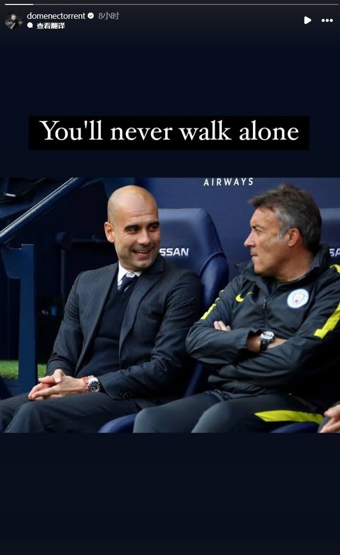 本賽季瓜迪奧拉帶領(lǐng)曼城成績不佳,壓力很大,而托倫特就曬出了自己與瓜帥的合照,并寫道:“你永遠不會獨行?!?/p>