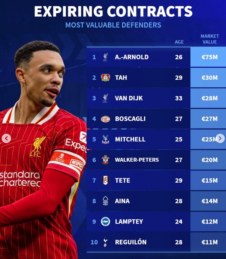 2月21日訊 《轉(zhuǎn)會市場》列出了合同今年到期的后衛(wèi)球員身價情況,阿諾德斷崖領(lǐng)跑。