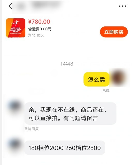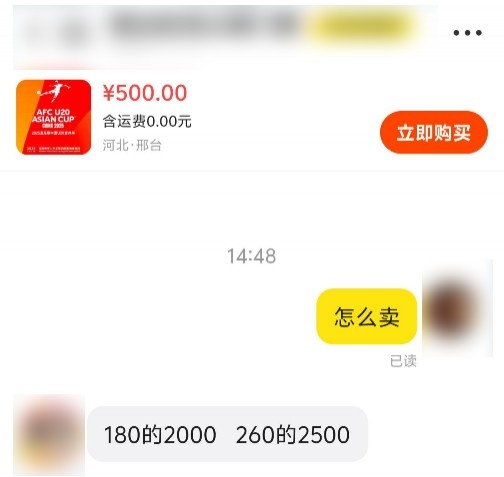 本場比賽門票開票后,1分鐘就售罄,銷售異常火爆!目前,有黃牛已經(jīng)將原價(jià)180元的門票炒至1000-2000元,其他價(jià)位的門票價(jià)格更高。