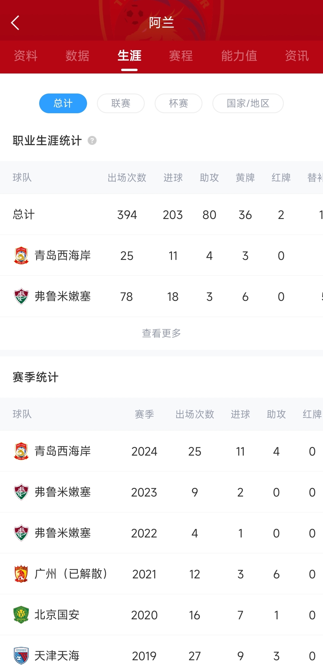 現(xiàn)年35歲的歸化前鋒阿蘭,上賽季代表青島西海岸出戰(zhàn)25場比賽,貢獻(xiàn)11球4助。國家隊層面,阿蘭至今代表中國男足出戰(zhàn)14場比賽,貢獻(xiàn)3球1助。