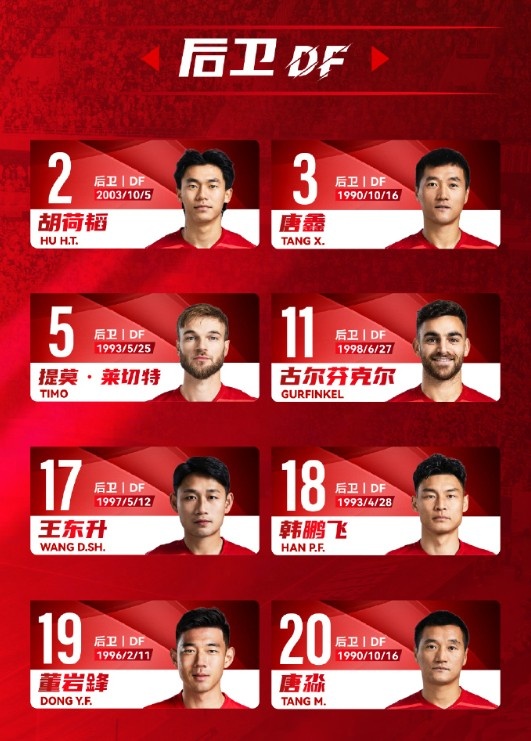 前鋒:7-韋世豪、9-費利佩、24-唐創(chuàng)、41-艾比布拉-努爾阿吉、45-艾孜買提-凱薩爾、47-伊薩-卡隆、48-李漠雨