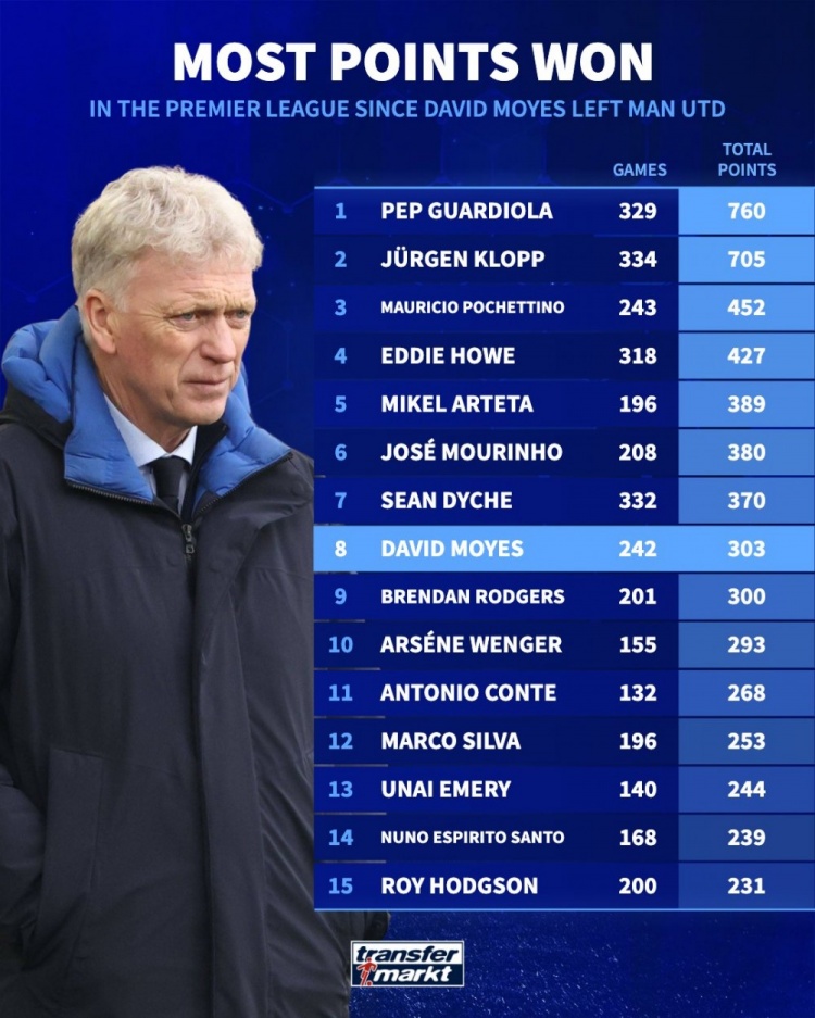 莫耶斯離開曼聯(lián)后主帥英超拿分榜: