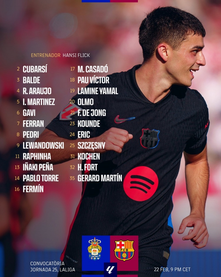 2月22日訊 北京時間明天凌晨4:00,巴薩將在西甲25輪中客戰(zhàn)拉斯帕爾馬斯。賽前,巴薩公布了將出戰(zhàn)這場比賽的大名單。其中,萊萬領(lǐng)銜,奧爾莫、亞馬爾在列,費(fèi)爾明解禁復(fù)出,法蒂缺席。