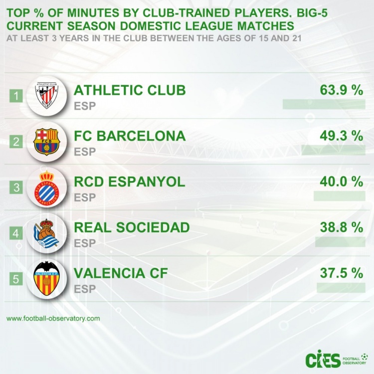 2月22日訊 瑞士足球天文臺統(tǒng)計了本賽季五大聯(lián)賽球隊自家青訓球員的出場時間占全隊的比例,并列出榜單,畢爾巴鄂63.9%居首,巴薩49.3%第二,前5名皆為西甲球隊。
