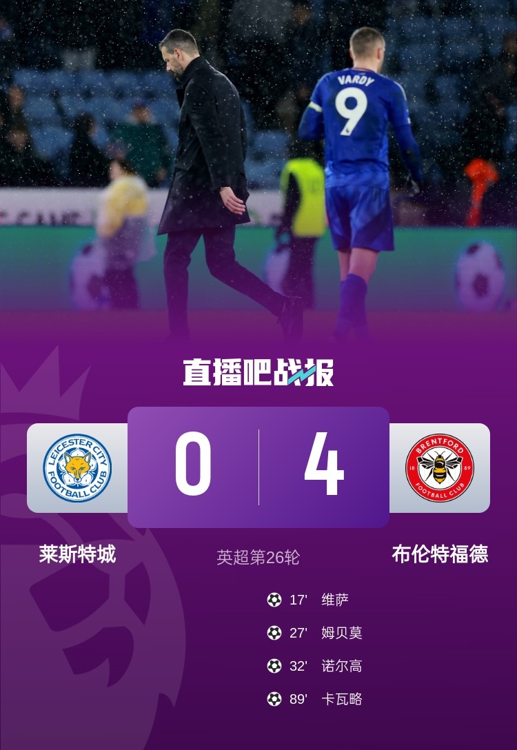 02月22日訊 英超第26輪,萊斯特城主場0-4慘敗布倫特福德,遭遇英超3連敗。