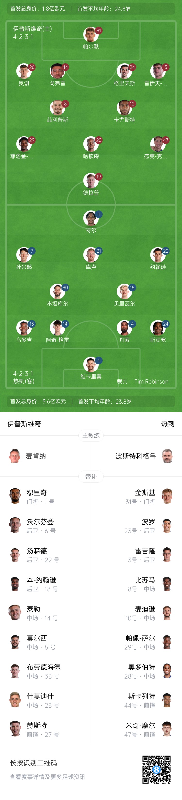 熱刺替補:31-金斯基、23-波羅、3-雷吉隆、8-比蘇馬、29-佩普-薩爾、10-麥迪遜、47-摩爾、28-奧多貝爾、44-斯卡利特