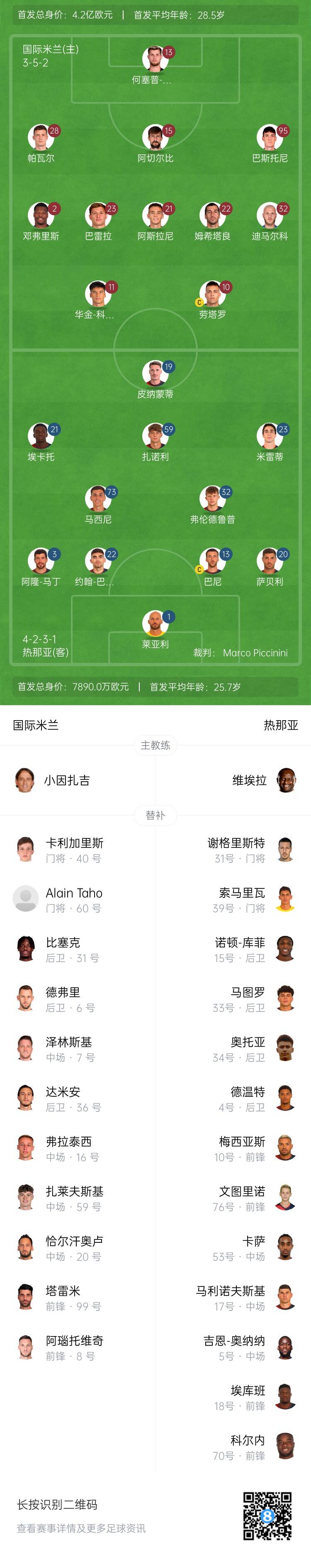 2月23日訊 意甲第26輪,國(guó)米主場(chǎng)對(duì)陣熱那亞。賽前,官方公布了本場(chǎng)的首發(fā)名單。