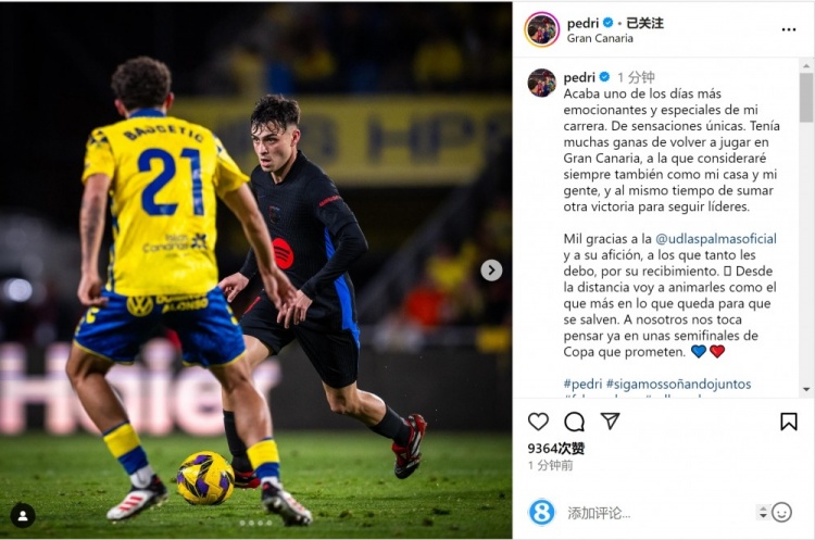 佩德里賽后在社交媒體上寫道:“我職業(yè)生涯中最激動人心、最特別的日子之一結(jié)束了,這是獨一無二的感覺。我真的很期待再次在大加那利球場比賽,我將永遠(yuǎn)把這里視為我的家,將你們視為我的球迷。同時再次取得勝利,繼續(xù)保持領(lǐng)跑位置。”