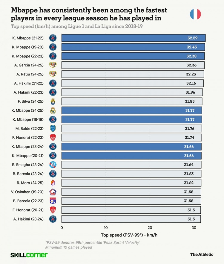 自2018/2019賽季以來(lái),法甲和西甲聯(lián)賽中速度最快球員統(tǒng)計(jì)