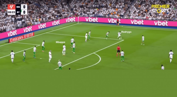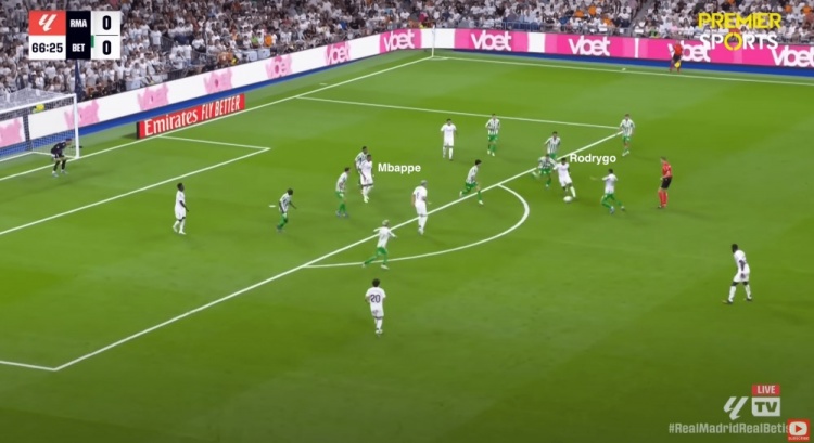 當(dāng)羅德里戈從右路帶球內(nèi)切之時(shí),姆巴佩背對(duì)著球門,以便更好地創(chuàng)造進(jìn)攻空間……