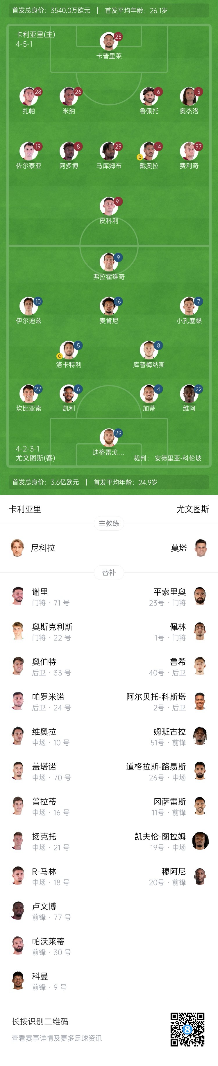 卡利亞里首發(fā):25-卡普里萊、28-扎帕、26-米納、6-魯佩托、3-奧杰洛、19-佐爾泰亞、8-阿多博、29-馬庫姆布、14-戴奧拉、97-奧利奇、91-皮科利
