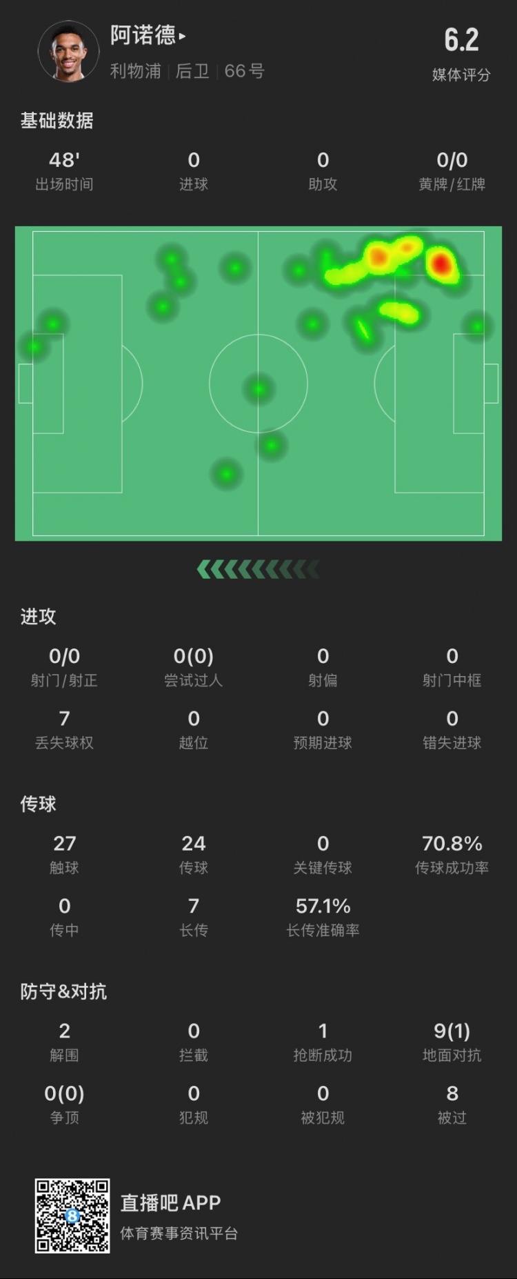 2月24日訊 英超第26輪,利物浦客戰(zhàn)曼城的比賽正在進(jìn)行。上半場,阿諾德8次被過、9次地面對抗只成功1次,獲評6.2分。