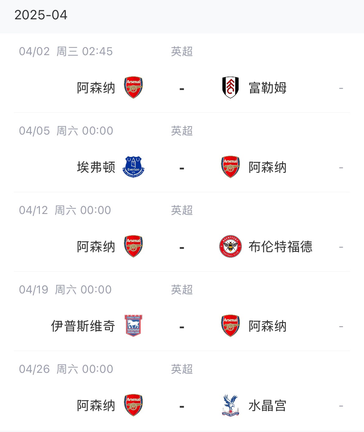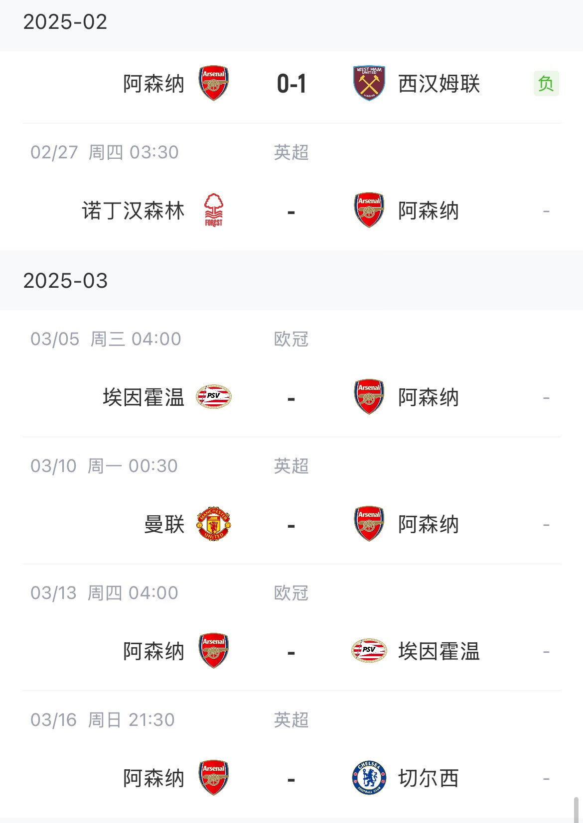 阿森納還剩12輪英超,接下來他們將先后對陣森林、曼聯(lián)和切爾西,5月中旬需連戰(zhàn)利物浦和紐卡。歐冠1/8決賽阿森納將對陣埃因霍溫,足總杯和聯(lián)賽杯他們均已出局。