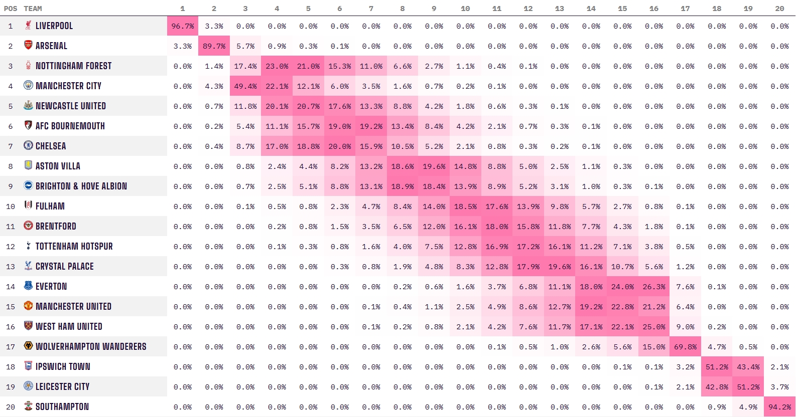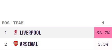 目前利物浦先賽已經(jīng)領(lǐng)先阿森納11分。數(shù)據(jù)機構(gòu)Opta的超級計算機演算顯示,利物浦的奪冠概率已經(jīng)來到了前所未有的96.7%,相比本輪之前上升了整整10個百分點。