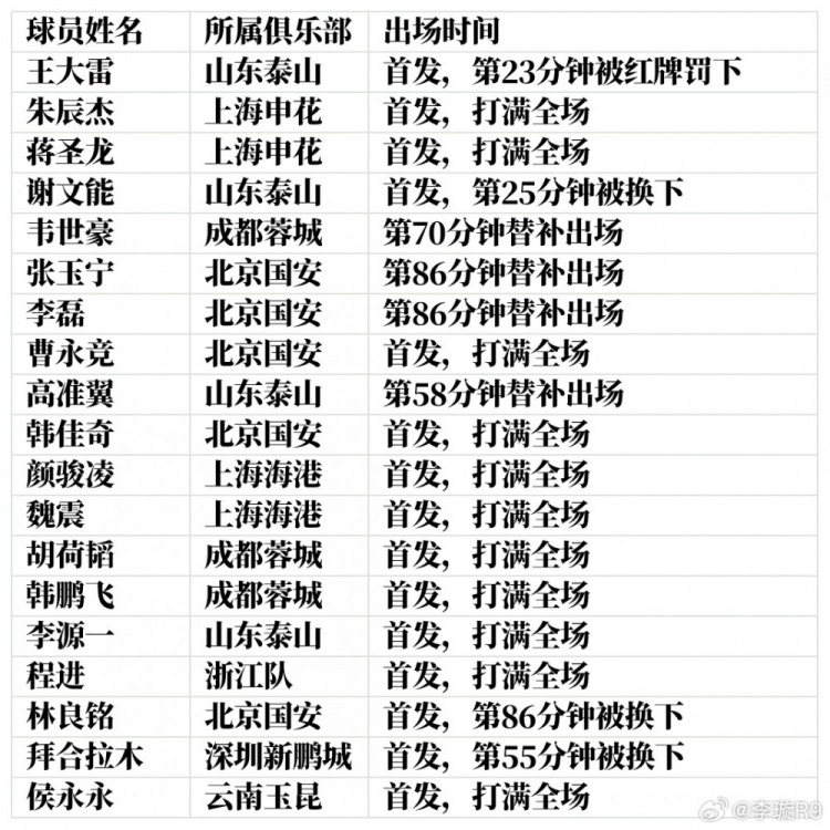 李璇在個人微博中寫道:參考國家隊1月份的集訓名單,統(tǒng)計了一下2025賽季中超首輪國腳的出場情況,圖為有出場記錄的球員,未出場球員(共13人,費南多因不在中超聯(lián)賽可忽略不計):蹇韜、楊澤翔、吾米提江-玉蘇普、吳少聰、徐皓陽、汪海健、王上源、黃政宇、買烏郎-米吉提、王子銘、楊立瑜、陶強龍、費南多。