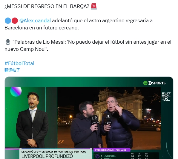 Alex candal透露,梅西將在不久的將來回到巴塞羅那。他還表示:“梅西的話是‘在新諾坎普球場踢球之前,我不能離開足球?!?/p>