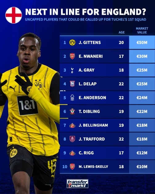 2月25日訊 英格蘭將在下月的世預(yù)賽中對陣阿爾巴尼亞以及拉脫維亞,圖赫爾也將公布執(zhí)教英格蘭的首期名單,德轉(zhuǎn)列出了10名未代表英格蘭成年隊(duì)出戰(zhàn)過,但本次可能入選圖赫爾首期名單的球員,吉滕斯、恩瓦內(nèi)里、斯凱利、喬布-貝林厄姆等人在列。