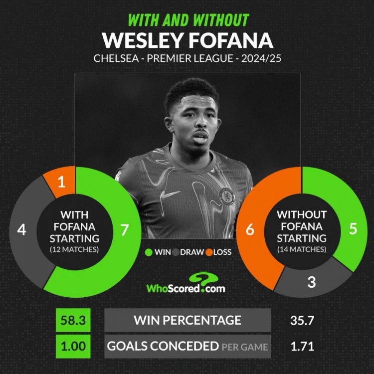 2月26日訊 切爾西在進(jìn)入2025年后的英超戰(zhàn)績斷崖式下滑,已經(jīng)跌至聯(lián)賽第7位。whoscored數(shù)據(jù)統(tǒng)計(jì)顯示,這可能與韋斯利-福法納的缺陣有關(guān):